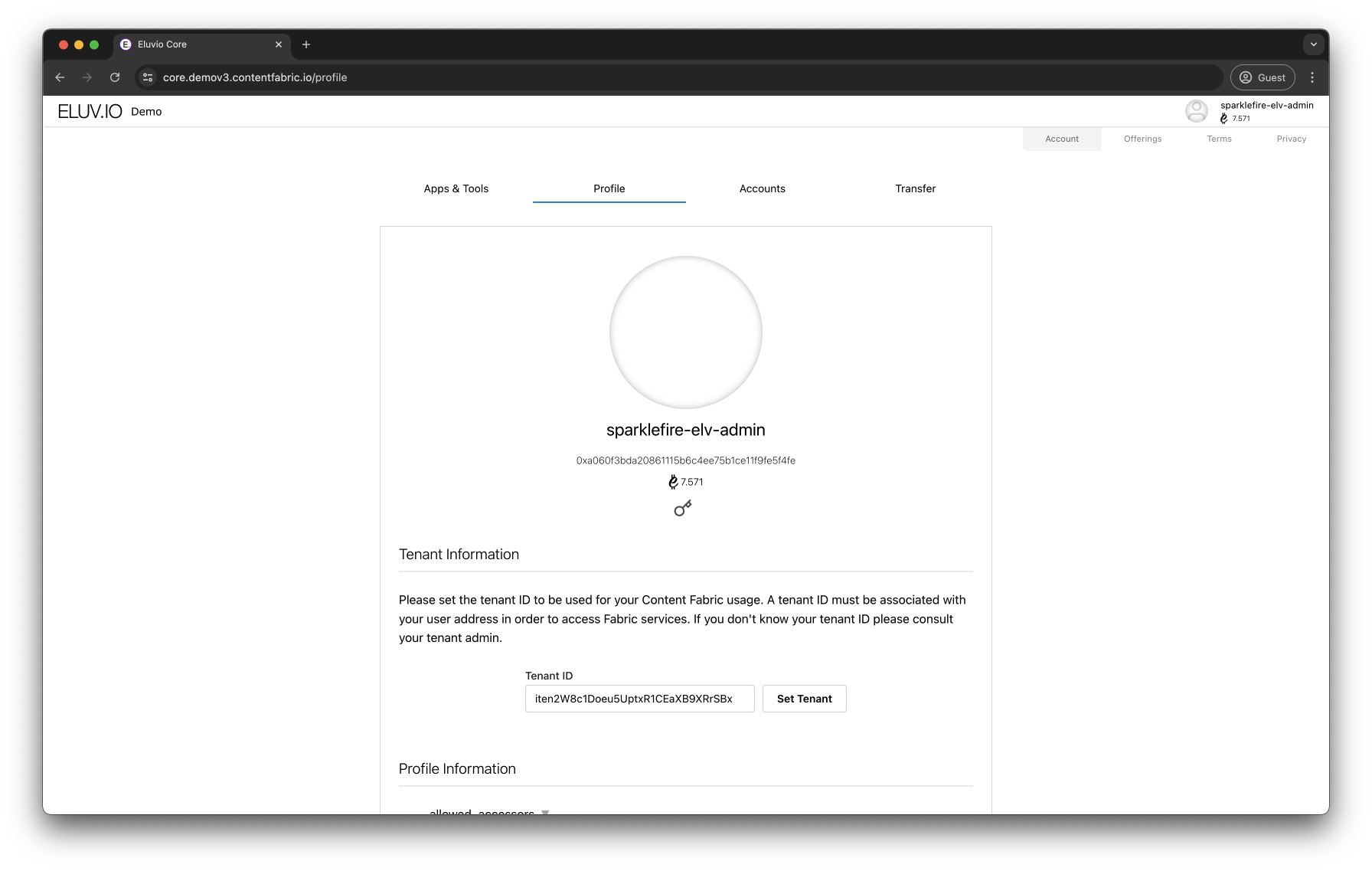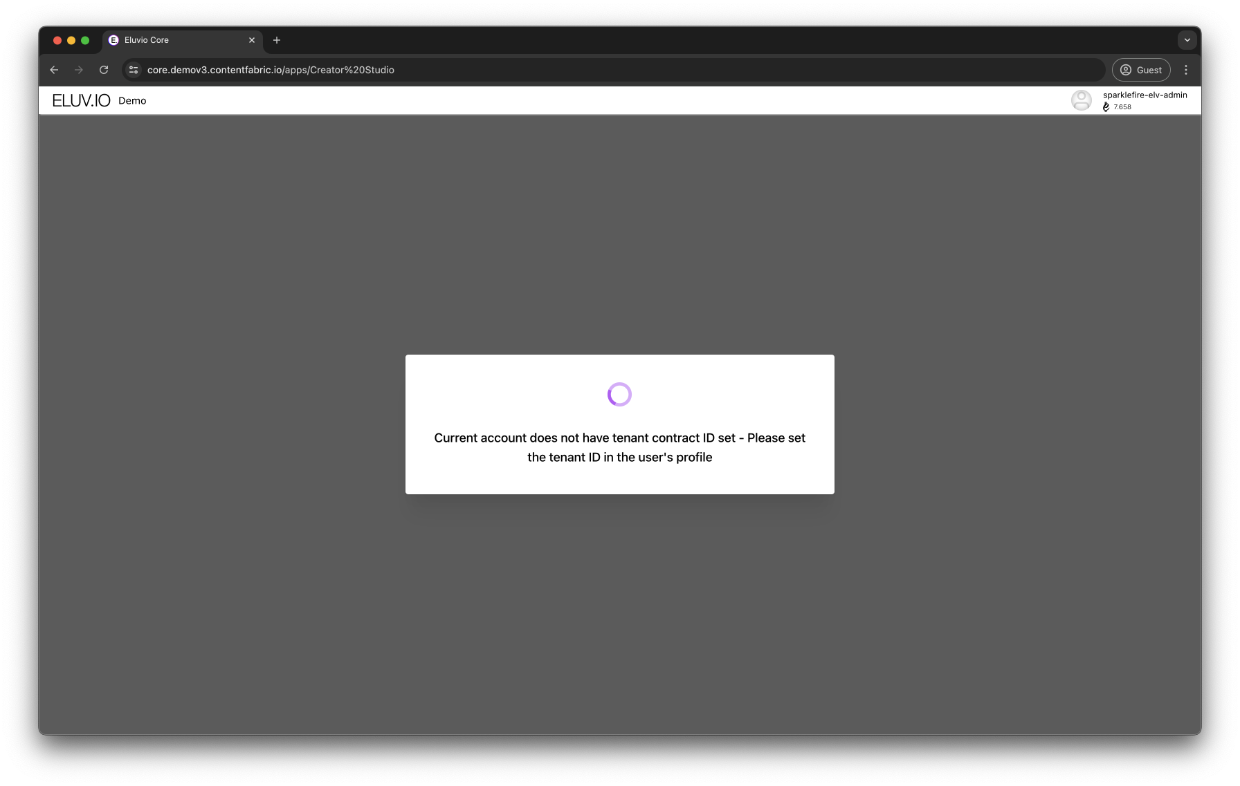 To access the Creator Studio app or any Core Fabric service, you must set a Tenant Contract ID in your Profile provided by Eluvio. If the account you are using does not have a Tenant Contract ID associated with it, you will receive the following error.