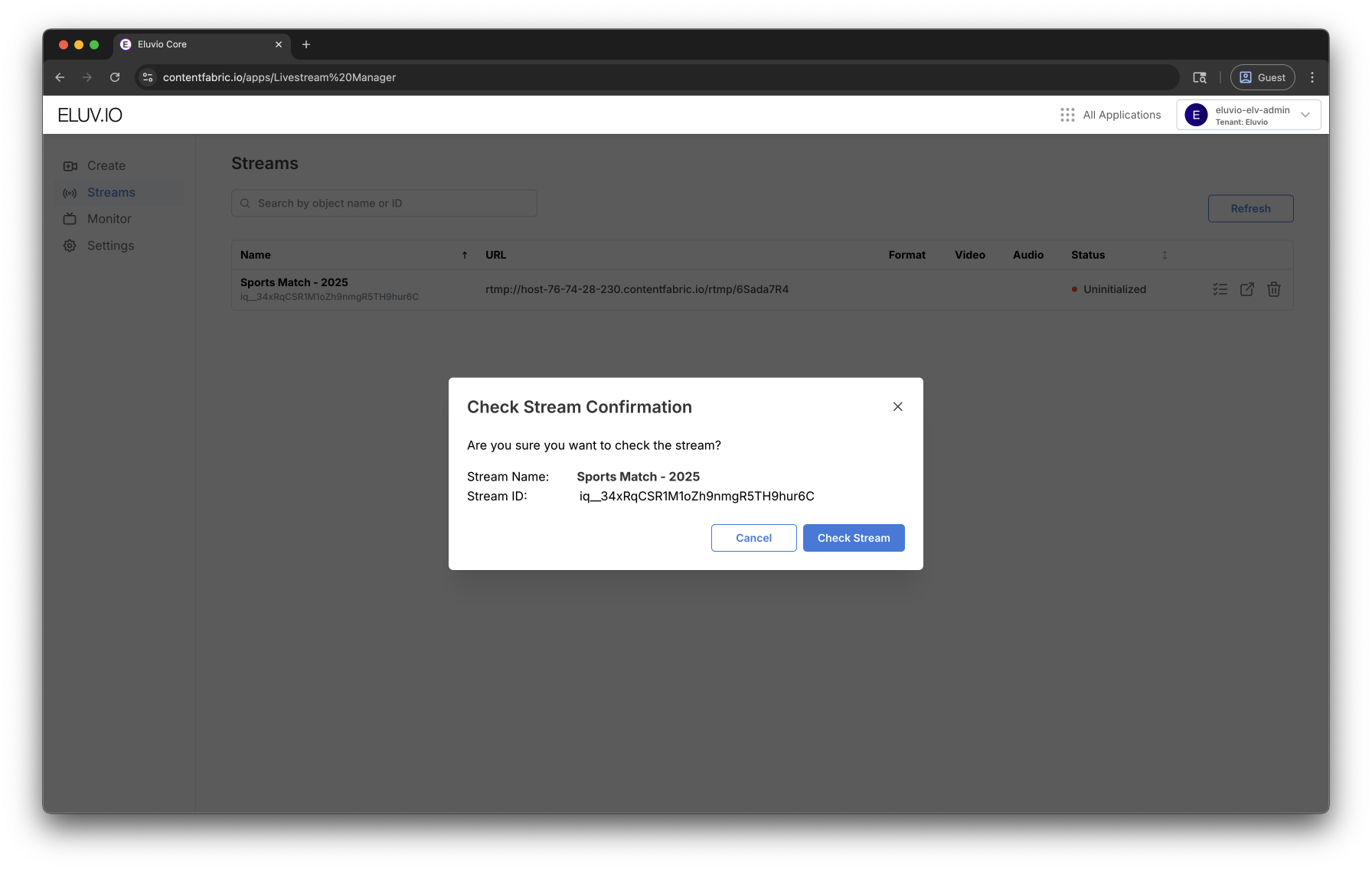 - Upon creation you will be taken to the Streams page. On the list of streams you will see your newly created stream in an “Uninitialized” state. To configure the stream click on the “check list” icon and confirm the “Check Stream” dialog.