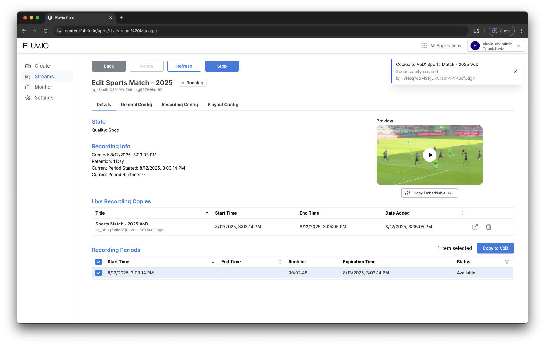 - On successful completion a notification will be displayed on the top right of the screen. Additionally, there will be an added entry to the “Live Recording Copies” table of the newly created VoD Object.