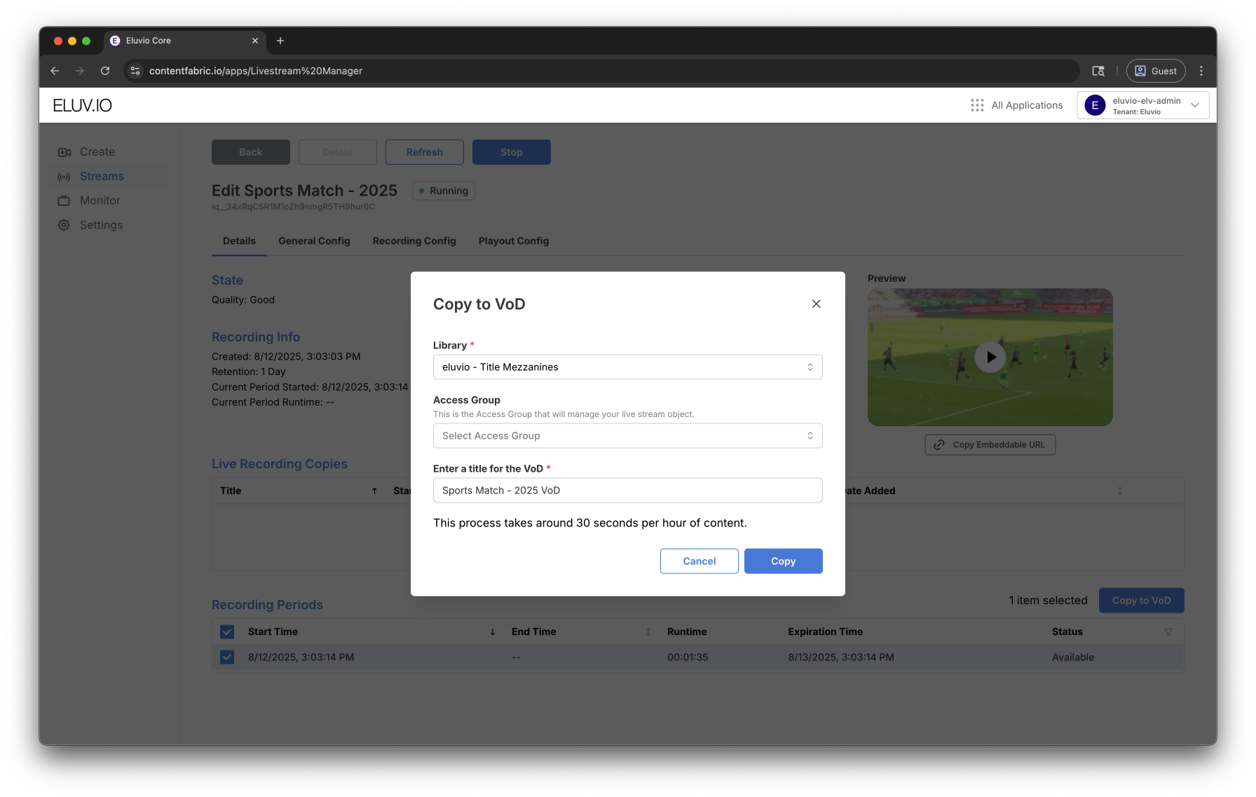 - After selecting a period click on the the “Copy to VoD” to begin the process. You will be presented with a modal to enter a name for the VoD. NOTE: This can take 20 seconds per hour of content.