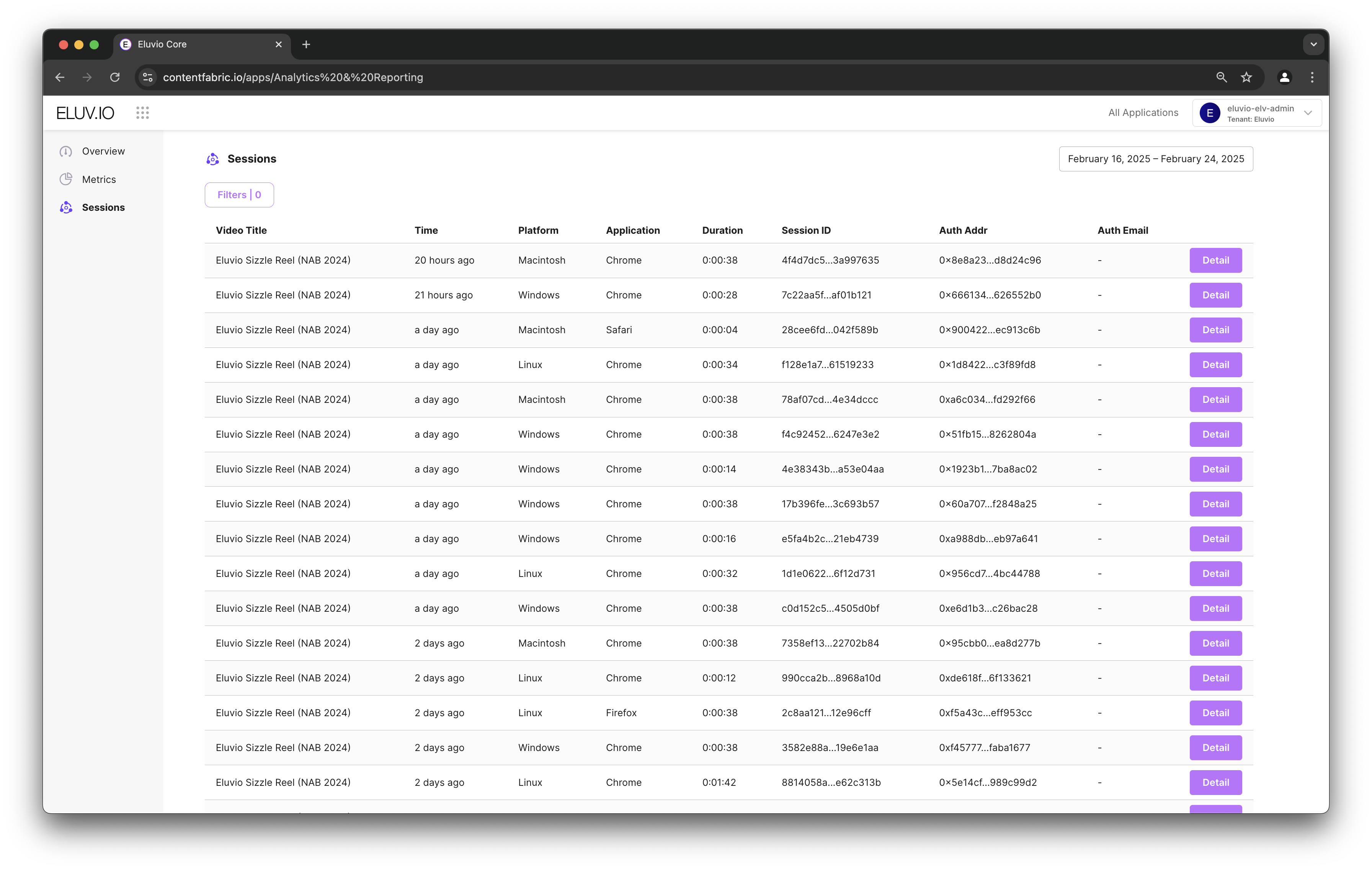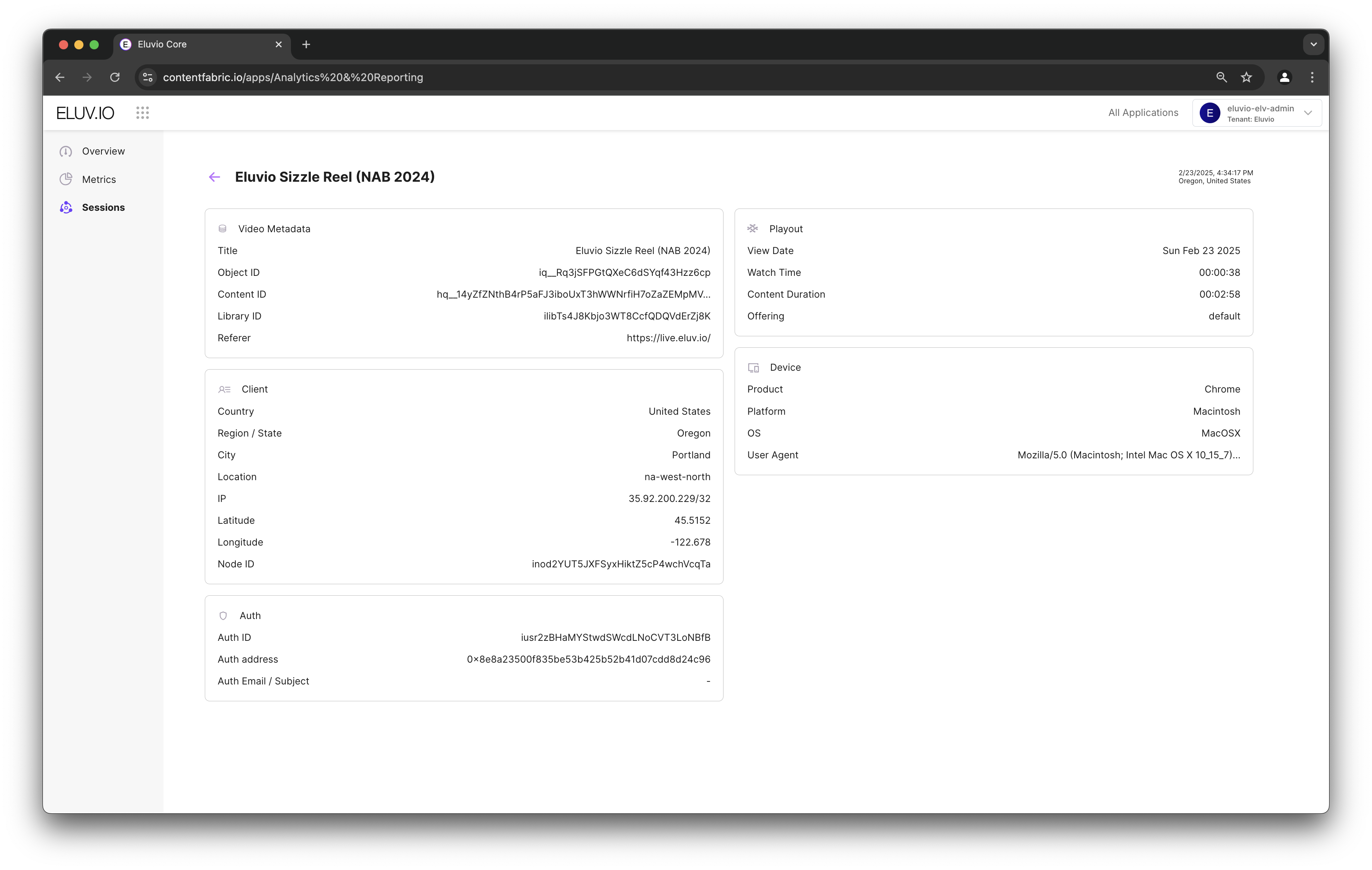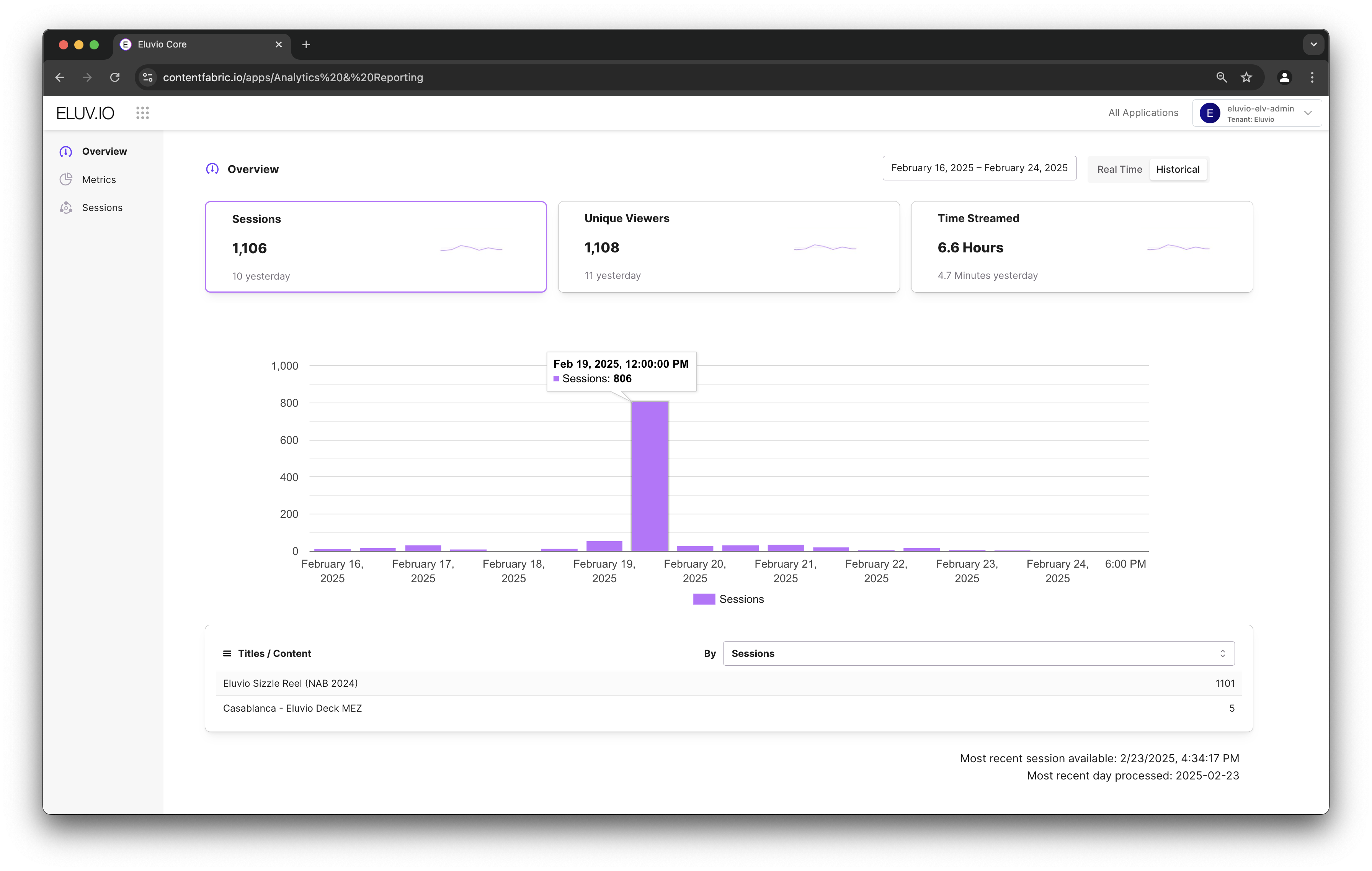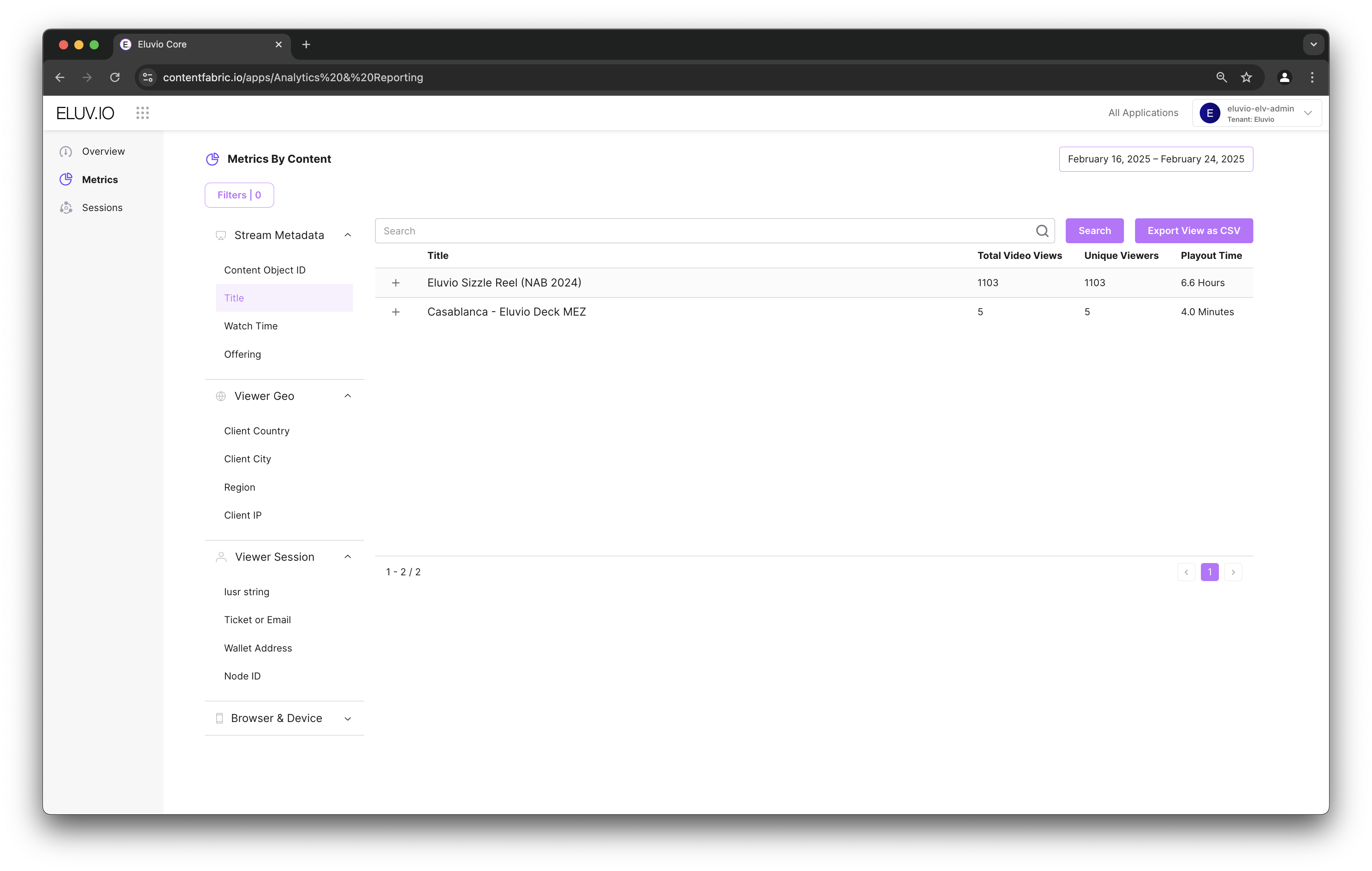 The Content Fabric collects detailed resource usage for each tenancy. This information is used to calculate utility charges and create usage reports. The new Analytics & Reporting app provides a detalied overview of every content object streamed under a specific tenancy. It displays valuable information regarding utility metrics, averge latency, total number of unique user sessions and client geolocation data on a specified period of time. Tenant Admins are able to apply multiple filters and export usage data to gain valuable insights of their streamed content.
